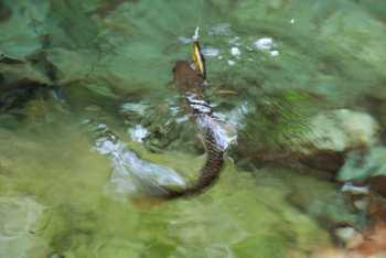 5月の渓は気持ちがいい…。 特に源流域は一番好きな季節。 追いもいい。 魚も綺麗。 渓の魚が一番遊んでくれる5月。 いつもは九頭竜釣行を共にする熊を 源流に連れて行く。 今日は朝から夕方まで1本の谷で過ごす。 昼飯、ガス、水 すべて背負い、入渓する。 たっぷりと… Photo ミノーが泳ぐ距離…僅か1m。 小さな岩の下から一気にミノーに襲いかかる!! 半畳ほどの溜まりから出した良型。 谷のアマゴ、岩魚は僕らを一日楽しませてくれた…。 久しぶりに気持ちの良い汗…。 また、かきたいと思う。 〜Tackle Data〜 Rod: WTS / LF-411L Reel: Cardinal 33 Cardinal 3X Lure: いろいろ… Line: 3lb Custom Wood Handle Knob |
