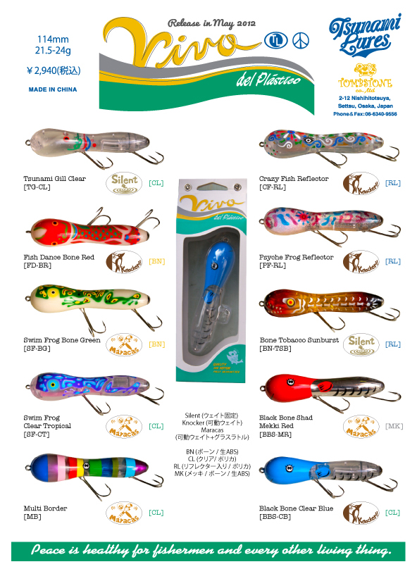 Movie>>> 津波ルアーズが考えるプラスチックペンシルの全てをここに凝縮。 ブランド初のインジェクション・ペンシルベイト= Vivo del Plastico(ヴィーヴォ・デル・プラスティコ)は、敢えてアナクロな二次元シェイプ、そして斜め45°浮き。 スライド、スケート、ターン、そしてダイブ、全方向3Dアクションを容易にこなします。 素材はポリカーボネートとボーン(ABS)、そしてそのそれぞれにノッカー(可動式ステンレスウェイト)、 マラカス(可動式ステンレスウェイト+グラスラトル)の2バージョン、さらにポリカーボネートにはサイレント(固定ステンレスウェイト)があり、 サウンドにバリエーションが豊富。 また、クリア、リフレクター、ボーン、メッキと、ボディーの性質にともなうフラッシング等の視覚効果のバリエーションも意識しました。 時にペンシルベイトが、中でもプラスチック製が威力を発揮することを、知っている人は知っています。 その原因がいったいどこにあるのか、納得のいく原理には誰も到達出来ていないはず。 ただ、Vivoにはその理由であると思われる、浮き角度、アクション、サウンド、フラッシング・・・ほとんど全てが詰め込まれているのです。 ![]() |