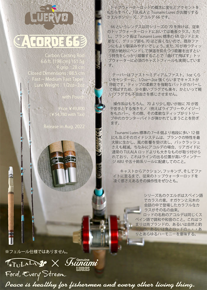 11月下旬頃発売予定!! 先着順でご予約承ります。 無くなり次第受付終了となります。 Cuervo Acorde 70 クエルボ・シリーズ アコルデ70 Carbon Casting Rod 7 ft. [213 cm] 167.5g R grip (リールシートのセンターからグリップの下端) : 32 cm Closed Dimensions (仕舞寸法) : 95 cm Fast ~ Medium Fast Taper Lure Weight: 1/2oz~2oz with Pouch ※フェルール仕様ではありません。 Price ¥49,800 (¥54,780 with Tax) Restock in Nov. 2025 TULALAとTsunami Luresのコラボレーションによって、独立したジャンルとして成立するトップウォーターのロッド概念に一石を投じるべく生まれたのがアコルデシリーズ。好評につき早くも再入荷。 従来のトップウォーターロッドに比べてかなり長い、アコルデ70の7フィートというレングスは、例えばジョンボートに直に座るスタイルでは長過ぎると考えられてきたものの、キャスト時にティップ部が絶妙にベンドして弾道を抑えつつ距離を出すことでその概念を覆す。これは遠目のディスタンスを取った上でオーバーハングを攻略するということにもつながるし、もちろん陸っぱりにもアドバンテージ。 ガイド数が多いのは、これによって距離が出る上、風の影響を受け難くバックラッシュし難い、というTULALA流理論による。 リアガイドには通常のTULALAロッドよりも大きなものを採用して、 ラインの出る位置が高いヴィンテージABUやソニックマスターなどの五十鈴系リールを考慮した。 また、フェルール仕様ではなく、グリップにオフセットではないFujiを採用しているところも通常のトップウォーターロッドとは異質。 ロープロリールにも向く。 テーパーはティップからバットまでバランスよく曲がるファスト〜ミディアムファスト。 1ozくらいをセンターに、2oz強から下は1/2ozくらいまでキャストが可能。 シリーズ名のクエルボはスペイン語でカラスの意。オガケンと元木の会話の中で登場したカラフルなカラスがその名の由来。 元木が監修するTULALAロッドにはこのシリーズ名が冠せられることになる。 ロッドの名称のアコルデは同じくスペイン語で調和や和音のこと。 これはつまりは両ブランドの、あるいは自然と釣り人の、あるいは魚とロッドの・・・ありとあらゆるハーモニーを意味する。 ![]() |