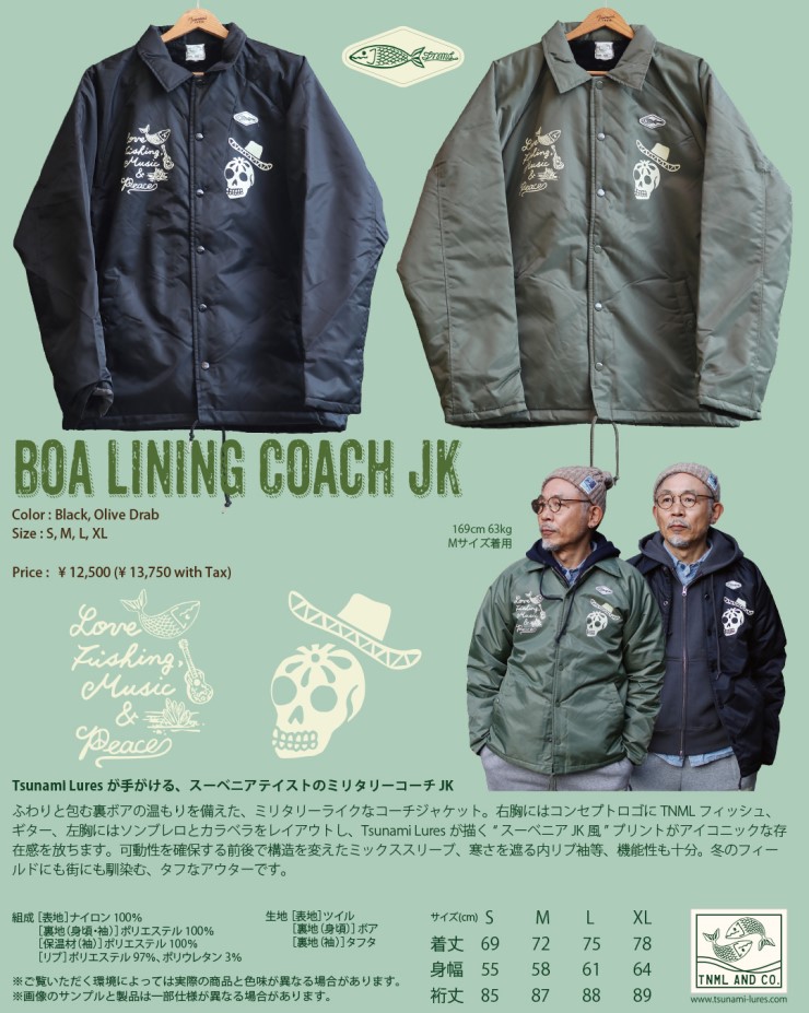 1月中旬頃発売予定! ご予約受付は12/19(金)PM6:00で締め切らさせて頂きます。 受注生産品の為、ご予約締め切り後のご注文には対応出来ませんので予めご了承下さい。 また、ご予約後のキャンセルはお受け出来ませんので、サイズをよくご確認の上、ご注文ください。 宜しくお願い致します。 2026NEW!! Boa Lining Coach JK 裏ボアコーチJK Color : Black, Olive Drab Size : S, M, L, XL Price : ¥ 12,500 (¥ 13,750 with Tax) Tsunami Luresが手がける、スーベニアテイストのミリタリーコーチJK ふわふわの裏ボアが頼もしいあたたかさをもたらす、ミリタリーライクなコーチジャケット。 右胸にはコンセプトロゴ、TNMLフィッシュ、ギターを、左胸にはソンブレロとカラベラをレイアウトし、Tsunami Luresらしいアイコニックなプリントで遊び心を添えた“スーベニアジャケット風”の表情に仕上げました。 袖口は内リブ仕様で、すっきりとした見ためと防風性を両立。 肩まわりは、フロントをゆるやかなS字のフリーダムスリーブ、バックを直線的なラグランスリーブとしたミックス構造により、ビジュアルにアクセントを加えながらも、可動域が広く動きやすいつくりです。 デザイン性と機能性を兼ね備えた、冬のフィールドからストリートまでタフに活躍する一着です。 ![]() 2026NEW!! Embroidery Sweat Parka チェーン&サガラ刺繍 フルジップ・スウェットパーカ Color : Ash, Navy, Sumi Size : S, M, L, XL ¥13,000 (¥14,300 with Tax) 古き良き技が息づく、ヴィンテージライクなスウェットパーカ ゆったりとしたボックスシルエットが、古いスウェットに通じる落ち着きと風合いを漂わせる一着。 その佇まいに、Tsunami Luresらしいオールドスクールのムードを、昔ながらの特殊ミシンで生み出されるチェーン&サガラ刺繍で贅沢に重ねました。 バックにはコンセプトロゴとTNMLフィッシュを、独特の運針で柔らかなラインを描くチェーン刺繍で大胆に配置。 フロント左胸には筆記体ロゴと「273」をあしらい、「273」だけをサガラ刺繍でふっくらと立ち上げています。 チェーンとサガラ、それぞれ異なる専用ミシンで丁寧に施された刺繍が、シンプルなスウェットに豊かな奥行きを与える仕様。 盛り上がる糸の立体感、惜しみなく使われた糸量、そして着込むほど深まる表情。 ヴィンテージスウェットを思わせる風合いに、現代のクラフトワークが息づく、こだわりのパーカです。 ![]() 2026NEW!! TNML Fish Sweat Pants Color : Heather Gray, Navy, Black Size : S, M, L, XL, XXL ¥6,900 (¥7,590 with Tax) ![]() |