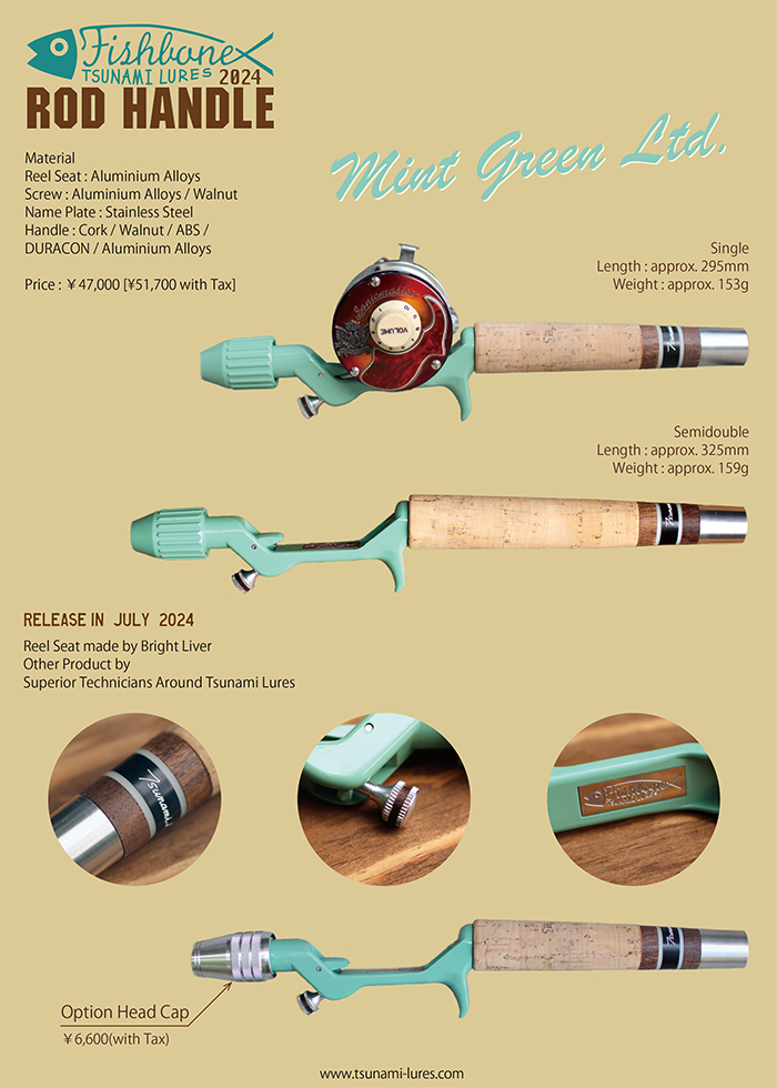 12月中旬頃発売予定! 先着順でご予約承ります。 無くなり次第受付終了となります。 2025NEW!! Fishbone Rod Handle “Coyote” フィッシュボーン・ロッド・ハンドル “コヨーテ” Single Length : approx. 293mm Weight : approx. 156g Semidouble Length : approx. 325mm Weight : approx. 163g Color : Coyote Material : Reel Seat : Aluminum Alloys Screw : Aluminum Alloys / Walnut Name Plate : Stainless Steel Handle : Cork or EVA / Walnut / ABS / DURACON / Aluminum Alloys Reel Seat made by Bright Liver Other Product by Superior Technicians Around Tsunami Lures Price : ¥48,000 [¥52,800 with Tax] 満を持して「Fishbone Rod Handle」に新色・コヨーテが登場。 あらゆるタックルに馴染む万能のアースカラーは、着色塗装のグリップ自体が珍しいこともあり、その質感はひと味違う存在感を放ちます。 グリップは握り心地に定評のある、絶妙な太さとテーパーを備えたストレートタイプ。 いつものようにシングルとセミダブルの2種類のレングスを用意しました。 ハンドル素材は定番のコルクに加え、セミダブルのみブラウンEVA(デッドストックを発掘)もラインナップ。 ハンドル部は上から、コルク、ウォルナット、ABS、ジュラコン(Tsunami Luresロゴ入り)、ABS、ウォルナット、 そして削り出しアルミ(バランサー兼用)という構成。 リールシートにはFishboneロゴを刻印したプレートを装備。変わらぬ落ち着いた佇まいです。 元木がセミダブルをチョイスすることから、シングルとセミダブルの選ばれる割合は拮抗してきたこの頃です。 実際に応用範囲が広いのは相変わらずセミダブルだと思っています。 セミダブルならシングルハンドでのキャストも当然可能で、右利きの方であれば左手を添えることができ、そのメリットは想像以上。 Tsunami Luresのシングルが一般的なタイプよりやや長めで、軽く左手が添えられる仕様であるのは、その考え方に基づいています。 ※実際の商品とは色味が異なって見える場合があります。 ![]() |