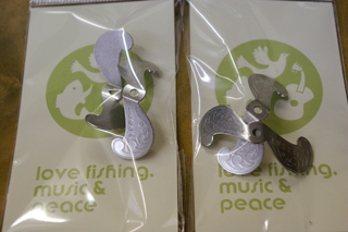 | ピック・フラップ Size : 27mm×31.5mm Material : Stainless Steel \880 taxin 完売 ティアドロップ型のピック(ギター用)をパロったフラップ。 とは言え侮るなかれ、しっかりと水面をチョップする。 しかもステンレス製でヘビーデューティー。 ギターも無理すれば弾けるかもしれません。 |