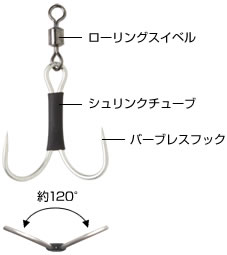 2015NEW!! ナマズ用ダブルフック [3本入り] \555 taxin ナマズ専用に開発したバーブレス仕様のダブルフックです。 約120度に開いたフックはフッキング率が大幅にアップ。 ナマズの激しいファイトでもフックが開きにくい シュリンクチューブ仕上げを施しています。 ローリングスイベルをセットしているため、 ファイト中にルアーが破壊されにくいのも大きな特徴です。 |