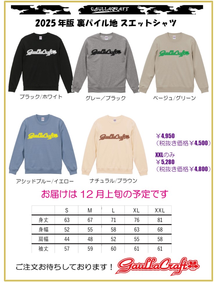![]() 2025NEW! 2025Ver.10.0oz.裏パイル地スエットシャツ \4,950 taxin XXLのみ¥5,280 taxin 5.6oz.コットン サイズ:S M L XL XXL