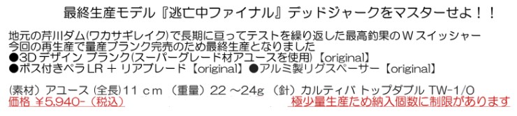 ![]() 岩魚【手書きアート】 オショロコマ【手書きアート】 レッドパンサー【手書きアート】 ブルーヘッド【缶スプレーアート】 サビ鮎【缶スプレーアート】 ------------------------------------------------------------- 2024NEW!! 逃亡中ファイナル \5,940 taxin