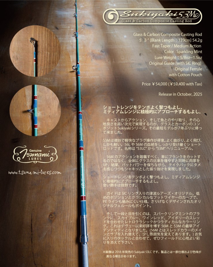 10月初旬頃発売予定!! 先着順でご予約承ります。 無くなり次第受付終了となります。 2025NEW!! Sukiyaki 53M スキヤキ 53M Color : Sparkling Mint Lure Weight: 5/8oz~1.5oz Price ¥54,000 (¥59,400 with Tax) ![]() |