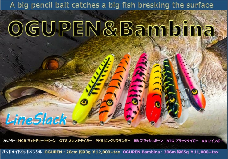 【OGUPEN】は、ランカー狙いに的を絞った ビックペンシル!! 水面を激しく割って出るバイトに大興奮できるビックペンシルの釣り! しかし水面に出し切れない、バイトがあれど乗らないなどの経験を持つ方には是非試していただきたいのがOGUPENです!! 魚へのアピールから食わせることを追求し幾度もテストを重ねたアクション、フッキング率には絶対の自信があります! シーバス、アカメ、etc… 予想を上回る大物とファイトすることを念頭に、全てのパーツを強靭なものにしています。 ワンピースボディーに、1.6mmSUSワイヤースルー構造で、ルアーの破損を最小限に抑えます。 ベリーフックはスイベルを介しバラシを軽減します。 OGUPENはフルハンドメイドのウッドルアーです。 ![]() |